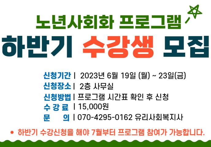 2023년 하반기 노년사회화 프로그램 수강생 모집 게시글 작성정보 작성자 임실군노인종합복지관 작성일 23-06-13 16:58 조회수 967 댓글수 0 목록 게시글 본문 많은 참여 바랍니다. 첨부파일 1개 2023년 하반기 노년사회화 프로그램 수강생 모집.jpg (192.2K) 1회 다운로드 첨부일시 : 2023-06-13 16:58:30 이전글 23년 3분기 운영위원회 회의 공지 23-06-29 다음글 2023년 구강보건의 날 맞이 구강건강증진교육 참여자 모집 23-06-07 댓글 0 등록된 댓글이 없습니다. 목록