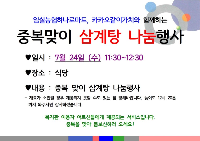 임실농협하나로마트, 카카오같이가치와 함께하는 중복맞이 삼계탕 나눔행사 안내 게시글 작성정보 작성자 임실군노인종합복지관 작성일 24-07-18 16:21 조회수 502 댓글수 0 목록 게시글 본문 많은 참여 바랍니다. 첨부파일 1개 2024년 중복행사.jpg (212.8K) 1회 다운로드 첨부일시 : 2024-07-18 16:21:56 이전글 2024년 교통안전 베테랑 교실 - 안전보행교육 2기 참여자 모집 24-07-22 다음글 무궁화복지월드와 함께하는 행복한 리마인드웨딩 참여자 모집 24-07-12 댓글 0 등록된 댓글이 없습니다. 목록