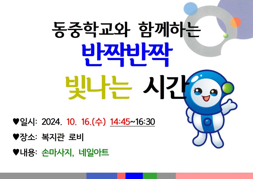 반짝반짝 빛나는 시간(네일아트, 손마사지) 참여 안내 게시글 작성정보 작성자 임실군노인종합복지관 작성일 24-10-08 17:04 조회수 455 댓글수 0 목록 게시글 본문 많은 참여 바랍니다. 첨부파일 1개 반짝반짝 빛나는 시간 홍보하반기.jpg (179.1K) 1회 다운로드 첨부일시 : 2024-10-08 17:04:36 이전글 무궁화복지월드와 함께하는 행복한 리마인드웨딩, 우정사진 촬영 참여자 모집 24-10-30 다음글 임실군노인종합복지관 노사협의회 12차 회의록 공고 24-10-02 댓글 0 등록된 댓글이 없습니다. 목록