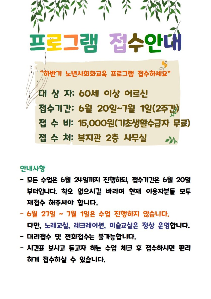 2022년 하반기 평생교육 프로그램 참여자 모집 게시글 작성정보 작성자 임실군노인종합복지관 작성일 22-06-20 11:25 조회수 1,068 댓글수 0 목록 게시글 본문 어르신들의 많은 참여 바랍니다. 첨부파일 1개 평생학습 홍보지22년 하반기 프로그램_22년 6월 17일 게시.jpg (154.3K) 2회 다운로드 첨부일시 : 2022-06-20 11:25:00 이전글 임실군기초푸드뱅크 활동 22-06-21 다음글 임실군노인종합복지관 낙상예방지킴이 활동 22-06-17 댓글 0 등록된 댓글이 없습니다. 목록