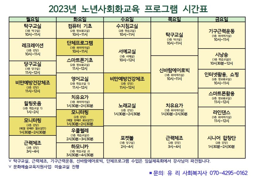 2023년도 노년 사회화 프로그램 시간표를 게시합니다.