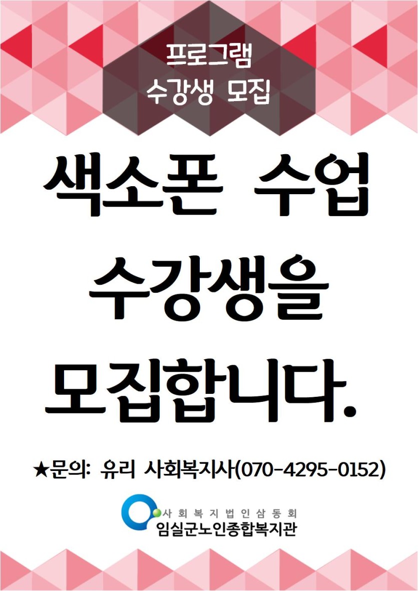 색소폰 프로그램을 추가로 신설하게 되어 이를 이용하실 수강생을 모집하오니 많은 참여바랍니다.