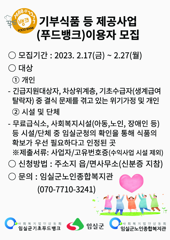 2023년 기부식품 등 제공사업(푸드뱅크) 이용자 모집 게시글 작성정보 작성자 임실군노인종합복지관 작성일 23-02-17 09:24 조회수 1,176 댓글수 0 목록 게시글 본문 많은 신청바랍니다. 첨부파일 2개 2023년 기부식품 등 제공사업푸드뱅크 이용자 모집.jpg (1.1M) 1회 다운로드 첨부일시 : 2023-02-17 09:24:46 이용신청서푸드뱅크.hwp (63.5K) 107회 다운로드 첨부일시 : 2023-02-17 09:24:46 이전글 임실군기초푸드뱅크 2022년 기부식품등제공사업 모집 및 제공결과 23-02-23 다음글 2023년 선배시민 자원봉사단 '노인권익지킴이' 모집 23-02-09 댓글 0 등록된 댓글이 없습니다. 목록