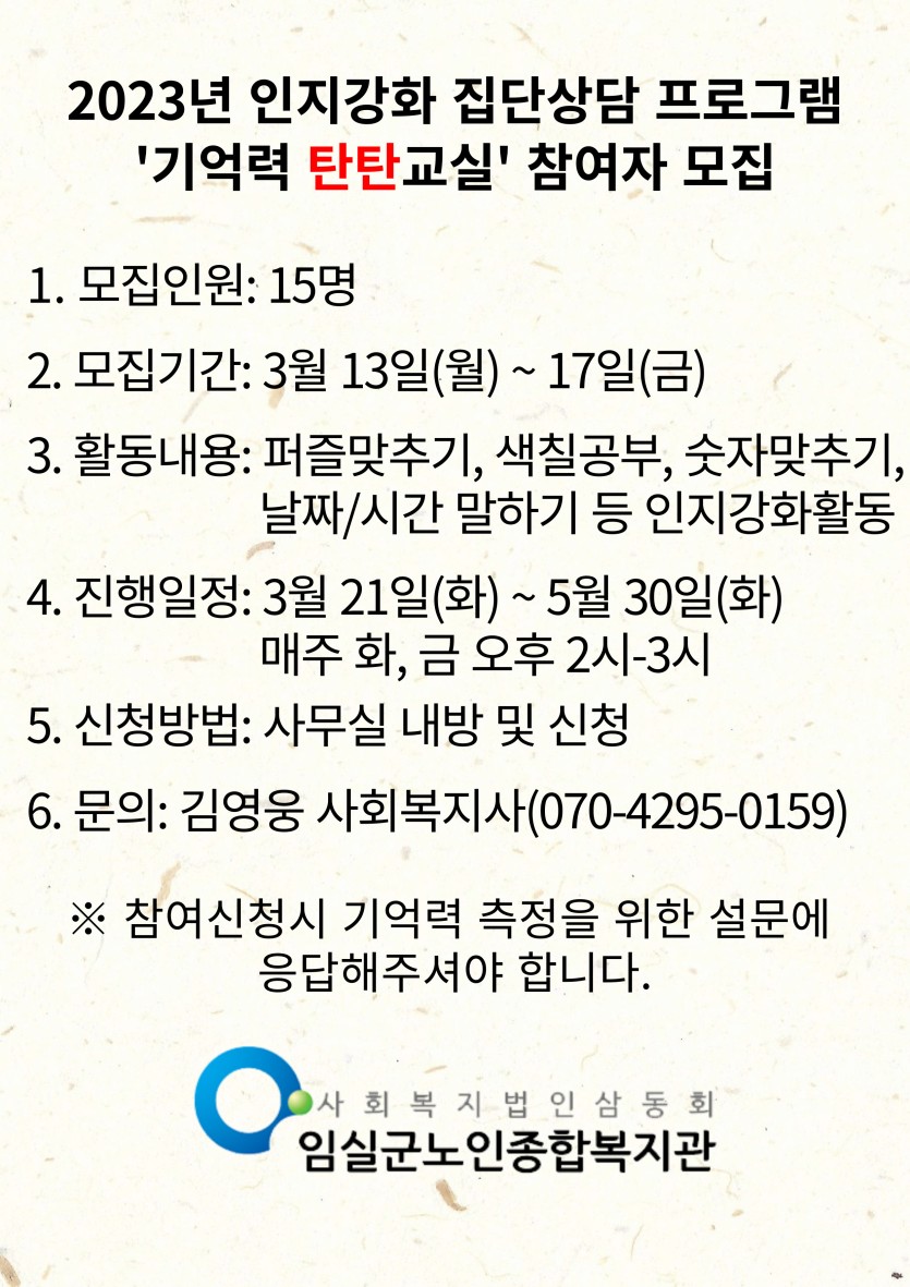 2023년 인지강화 프로그램 '기억력 탄탄교실' 참여자 모집