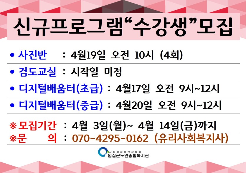 복지관을 이용해주시는 어르신들의 요구에 힘입어 4월부터 '사진교실, 검도교실, 디지털배움터(가게에서 기계로 계산하는 방법 배우기)' 3개 프로그램이 신설되어 참여자를 모집합니다.