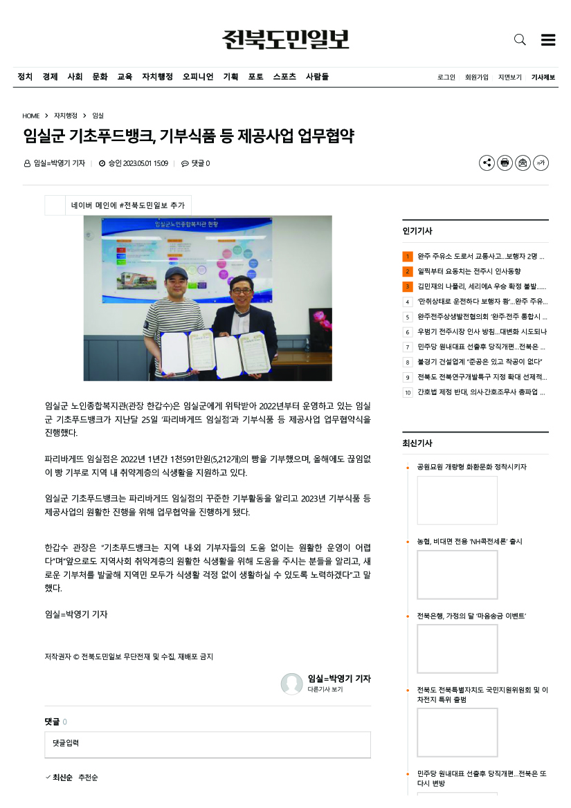 임실군기초푸드뱅크, 기부식품 등 제공사업 업무협약 게시글 작성정보 작성자 임실군노인종합복지관 작성일 23-05-11 10:14 조회수 833 댓글수 0 목록 게시글 본문 감사합니다. 첨부파일 1개 임실군기초푸드뱅크, 기부식품 등 제공사업 업무협약 - 전북도민일보.jpg (1.1M) 1회 다운로드 첨부일시 : 2023-05-11 10:14:50 이전글 임실군노인종합복지관, 어버이날 기념행사 23-05-11 다음글 카카오같이가치와 함께 하는 취약어르신 주거환경개선 23-05-11 댓글 0 등록된 댓글이 없습니다. 목록
